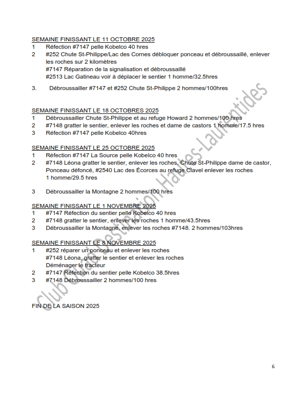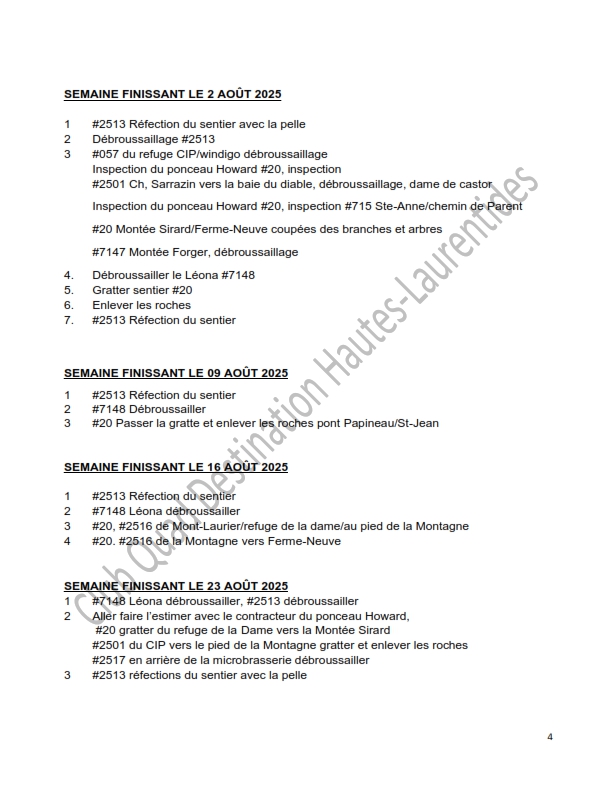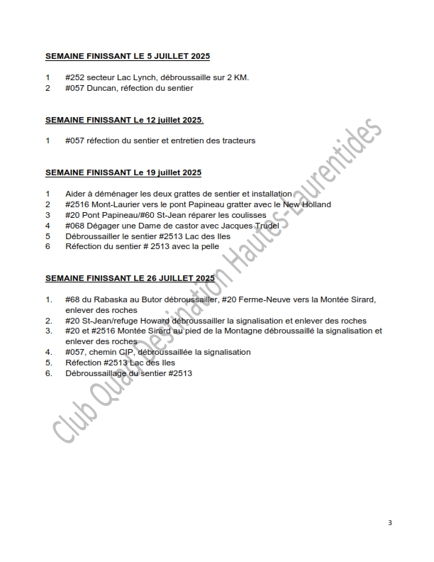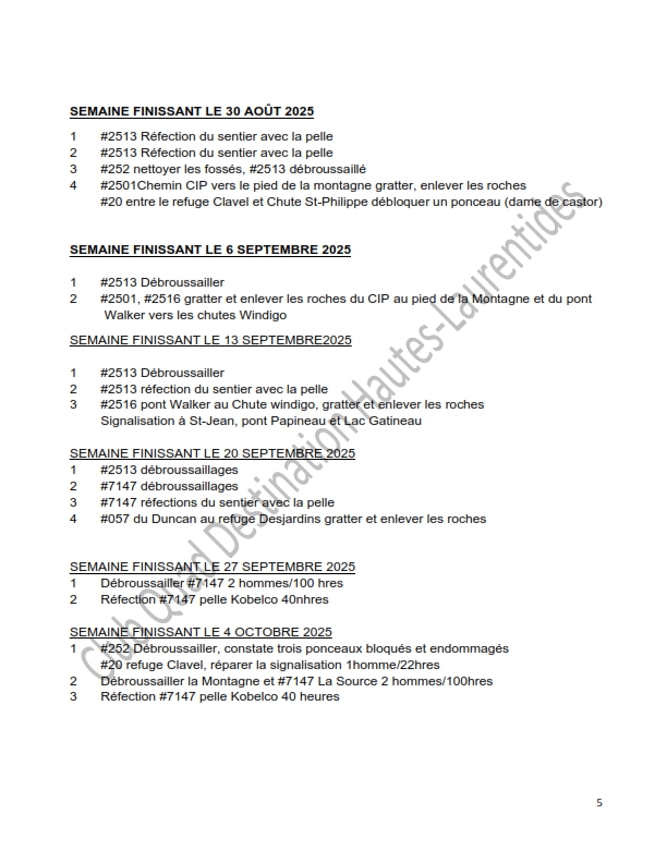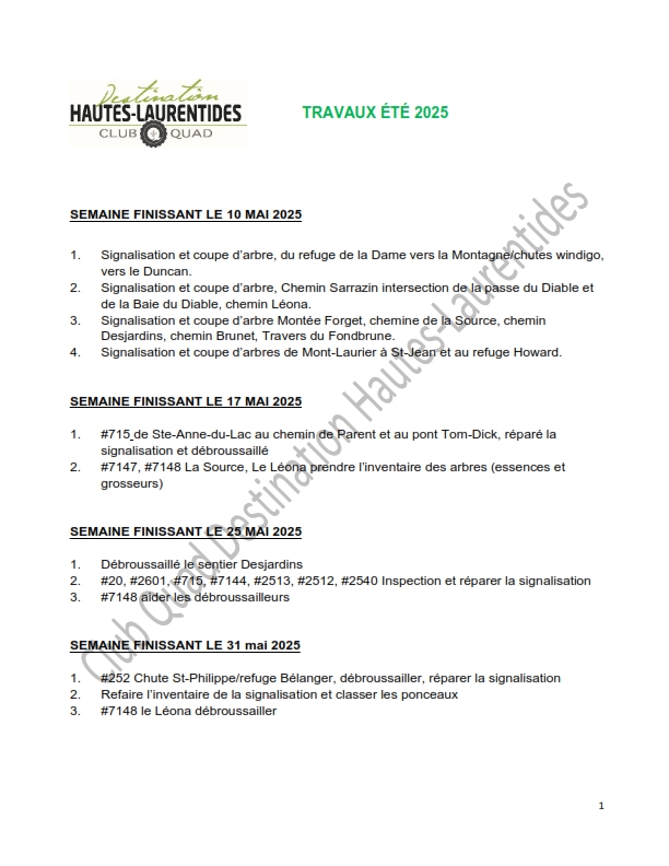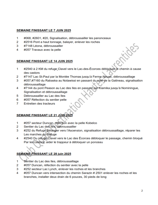 - Débroussailler le sentier 252 de la 724 jusqu’à L’Ascension et de la Zec Maison de Pierre jusqu’à Chute St-Philippe.